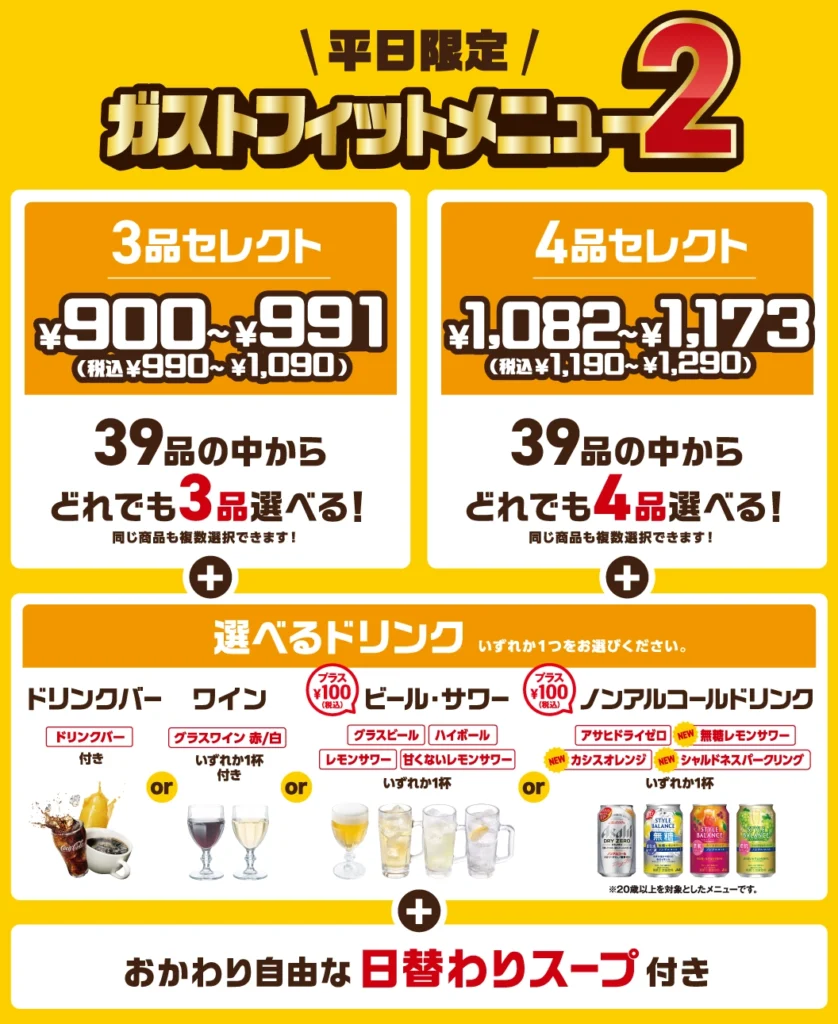 3品セレクトまたは4品セレクトにドリンクバーとおかわり自由の日替わりスープがついてくる構成です。